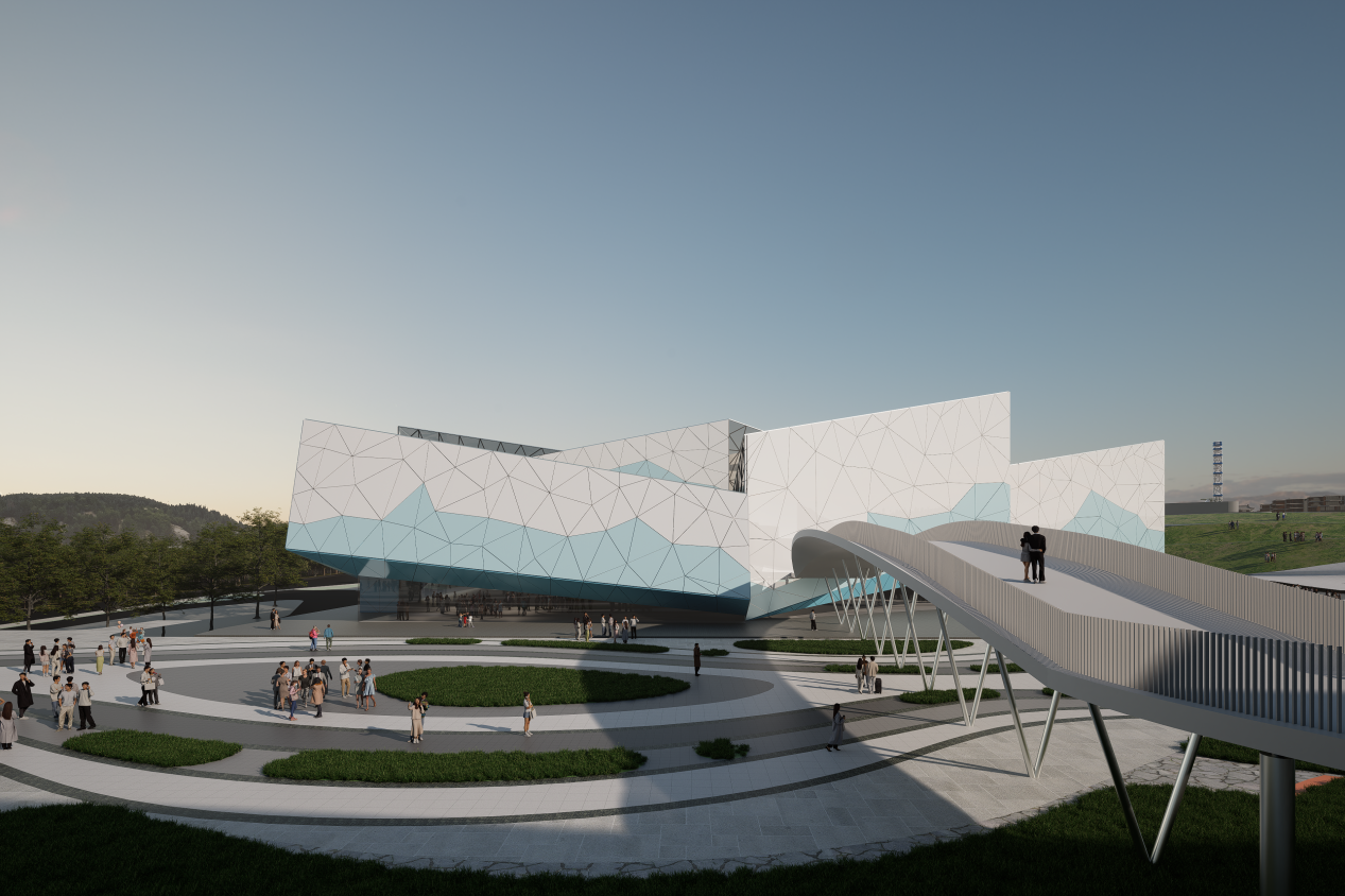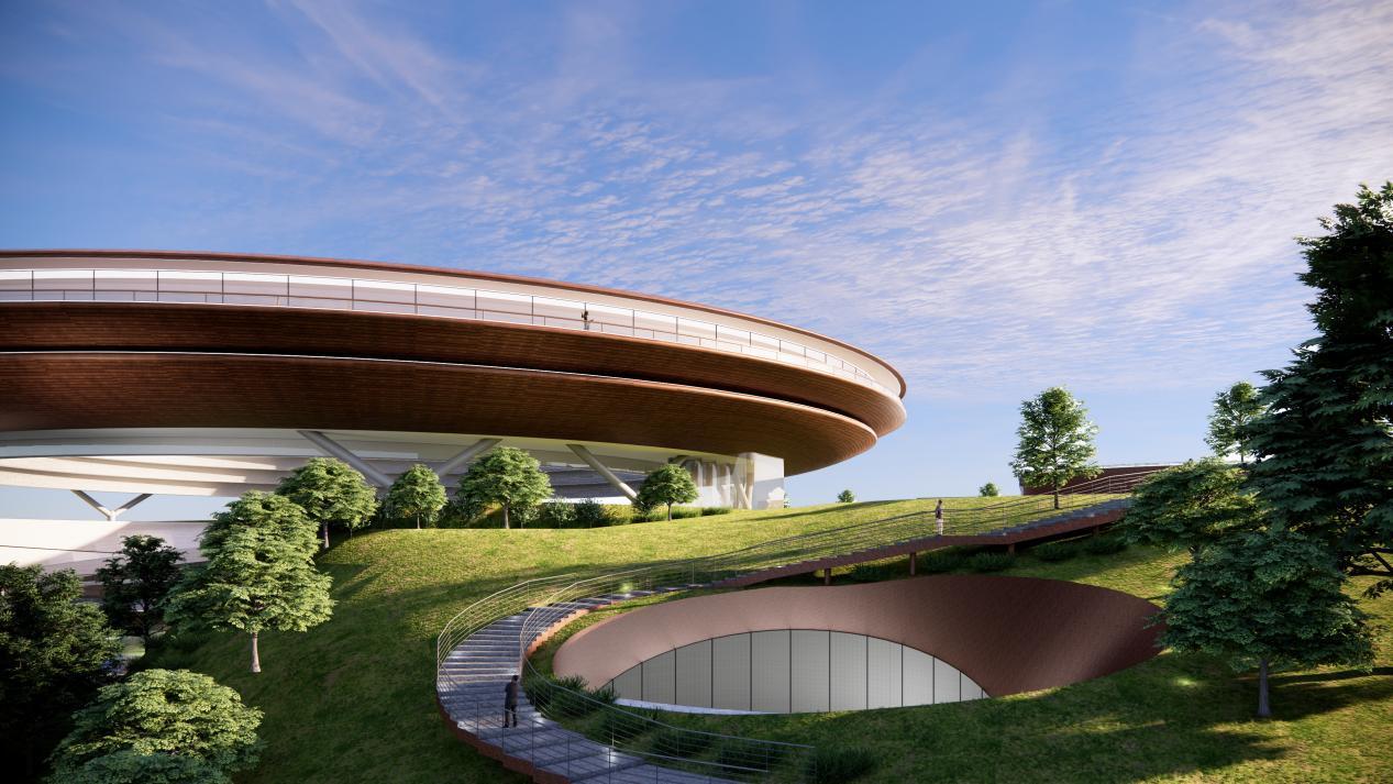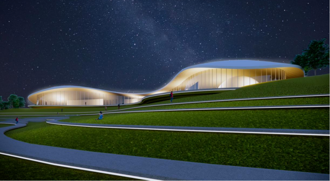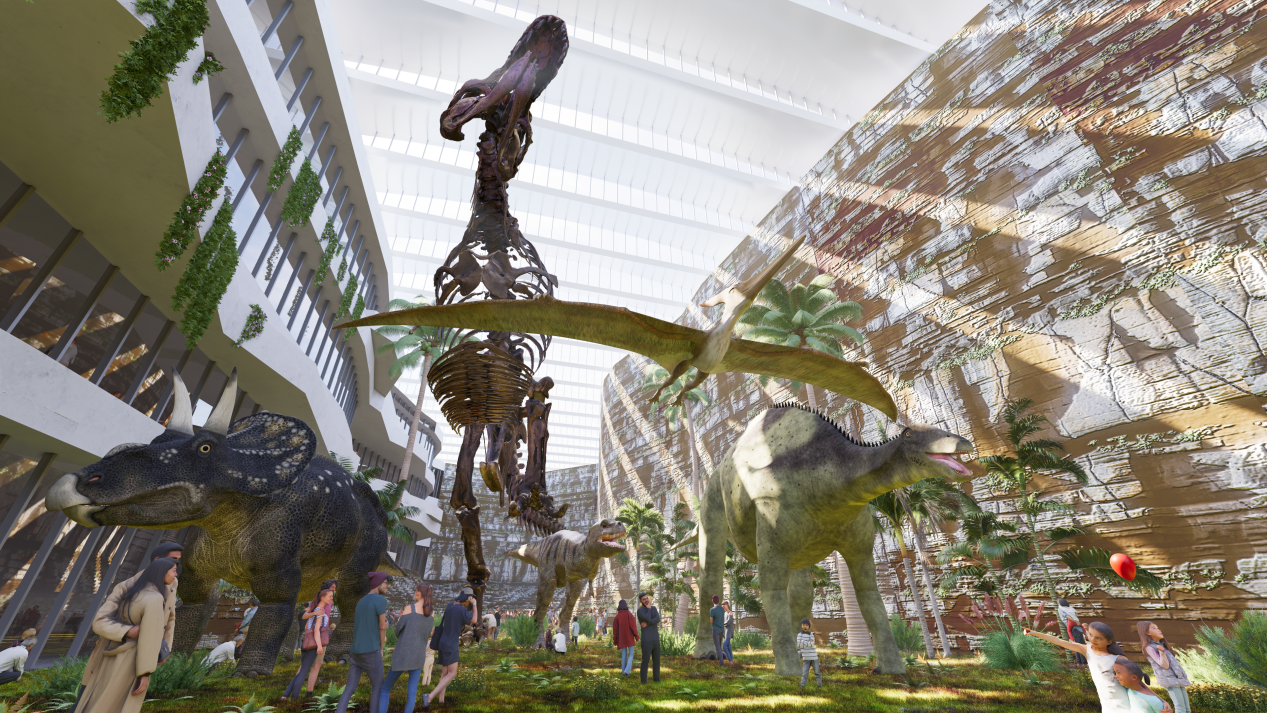 人与自然和谐共生馆效果图,将展出来自1亿6000万年前的世界级瑰宝——超40米全球最长的恐龙化石。