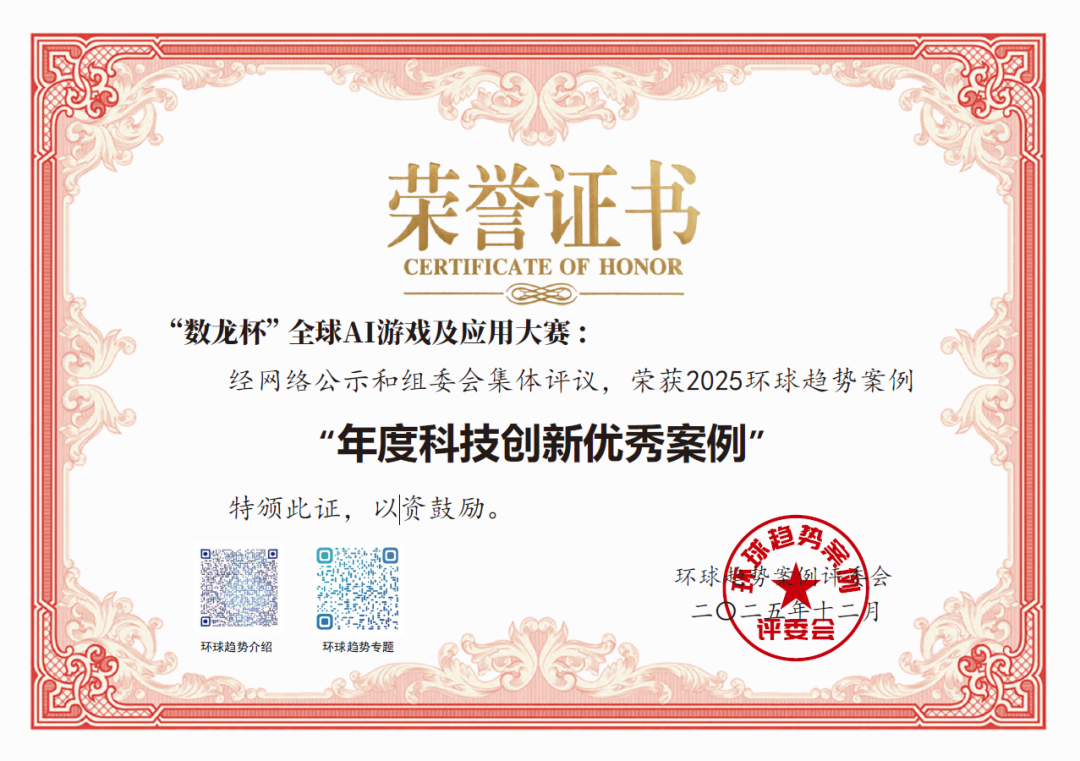 在科技创新领域,公司积极推动AI技术在游戏及各类应用场景中的创新,于今年成功举办的“数龙杯”全球AI游戏及应用创新大赛获得第六届环球趋势大会“年度科技创新优秀案例”的荣誉。本次大赛累计吸引151支团队踊跃参赛,征集有效作品120款,最终11支团队的11款精品力作脱颖而出,斩获六大奖项。大赛的成功举办,不仅将有效推动技术创新突破,为行业发掘优秀的AI人才及团队,促进产业链各方交流,推动AI产业生态繁荣,也将促进AI技术更深度渗透游戏研发,更全面介入应用场景,加速AI技术在互动娱乐乃至更多行业的普及,彰显了科技企业的责任与担当。